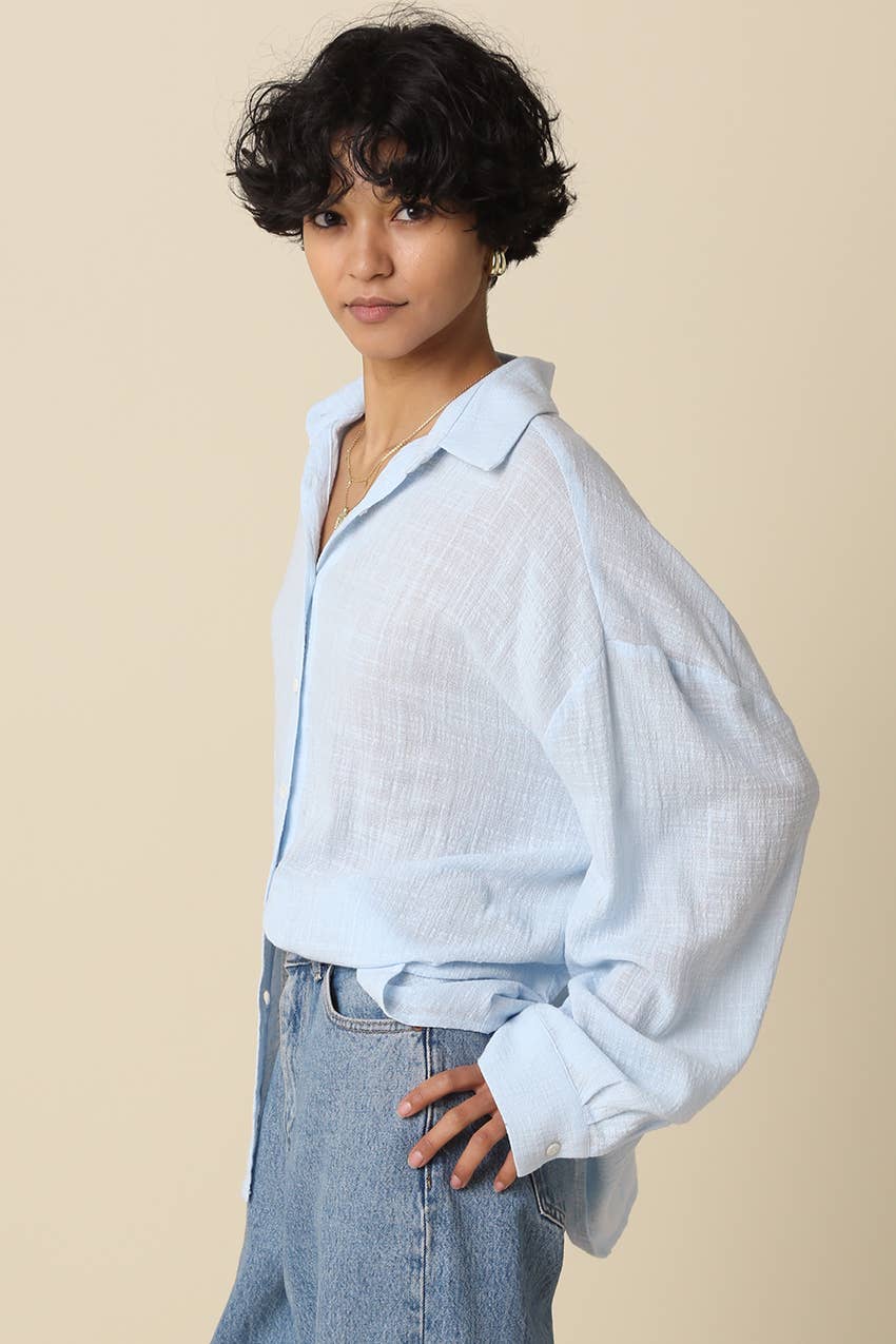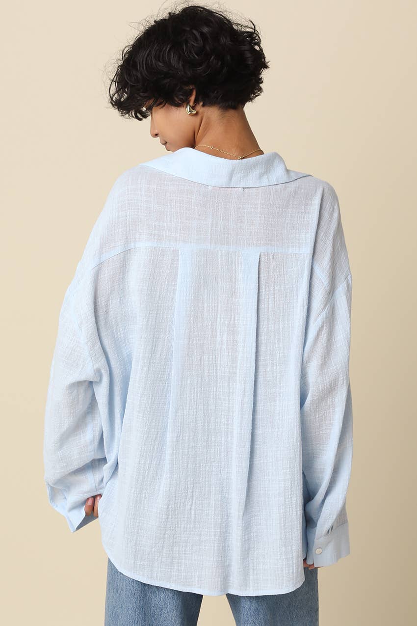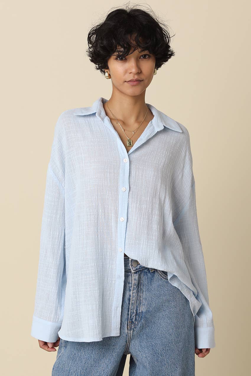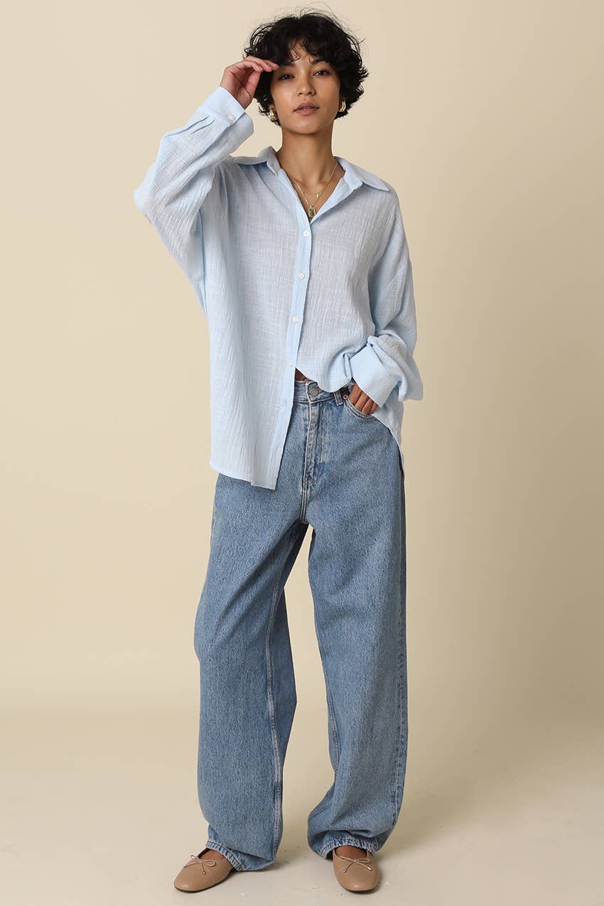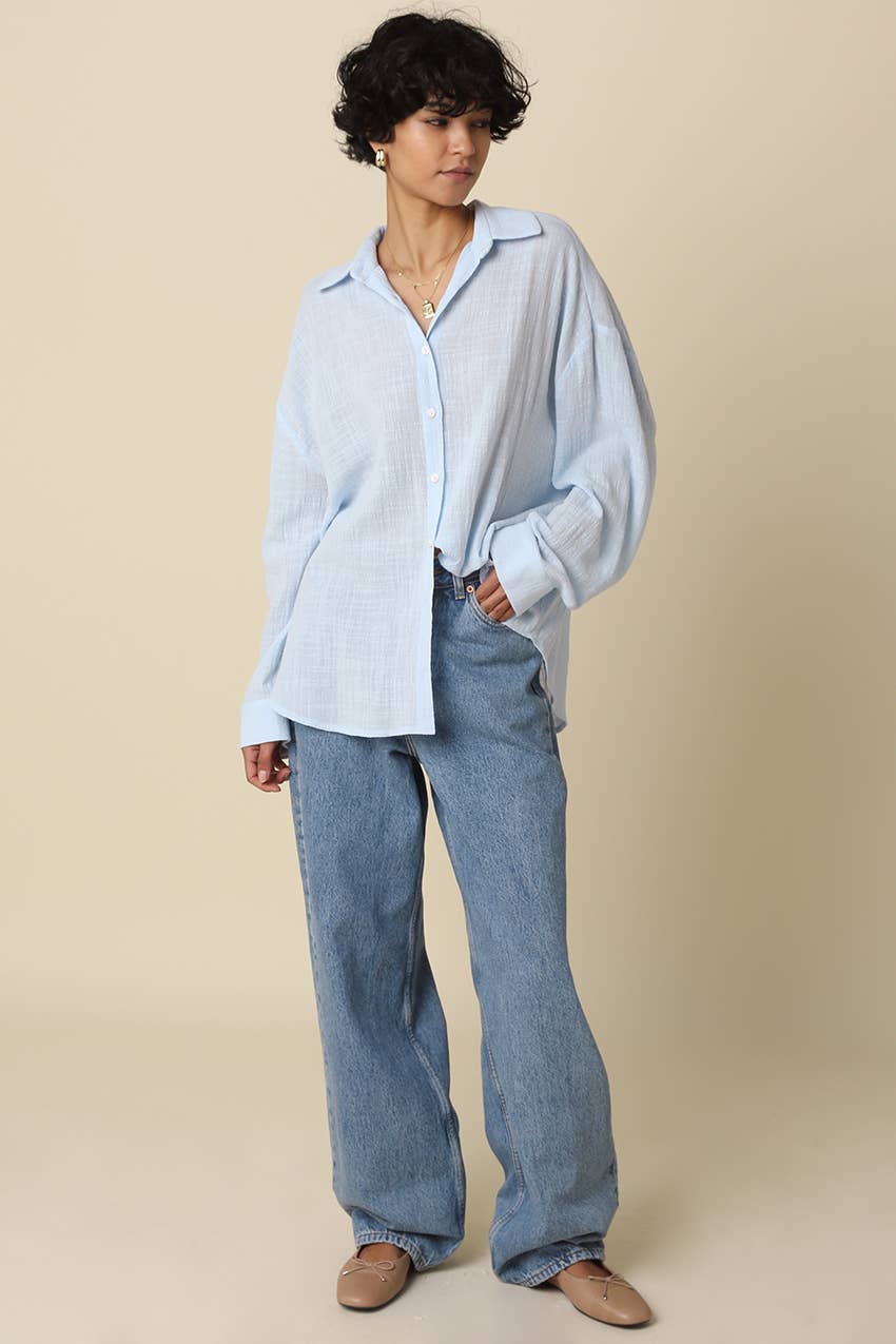 The Mila Lightweight Oversized Shirt is your new go-to for laid-back style that doesn't compromise on comfort. Crafted from soft, textured fabric, this piece drapes beautifully with a relaxed silhouette that works whether you're running errands or settling in for the weekend. The loose collar and drop shoulder sleeves create an effortlessly cool vibe, while the oversized cut gives you room to move and layer. Throw it on over a tee, tie it at the waist, or wear it solo—this versatile shirt adapts to your mood and your wardrobe. Perfect for anyone who believes comfort and style should always go hand in hand.